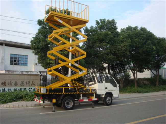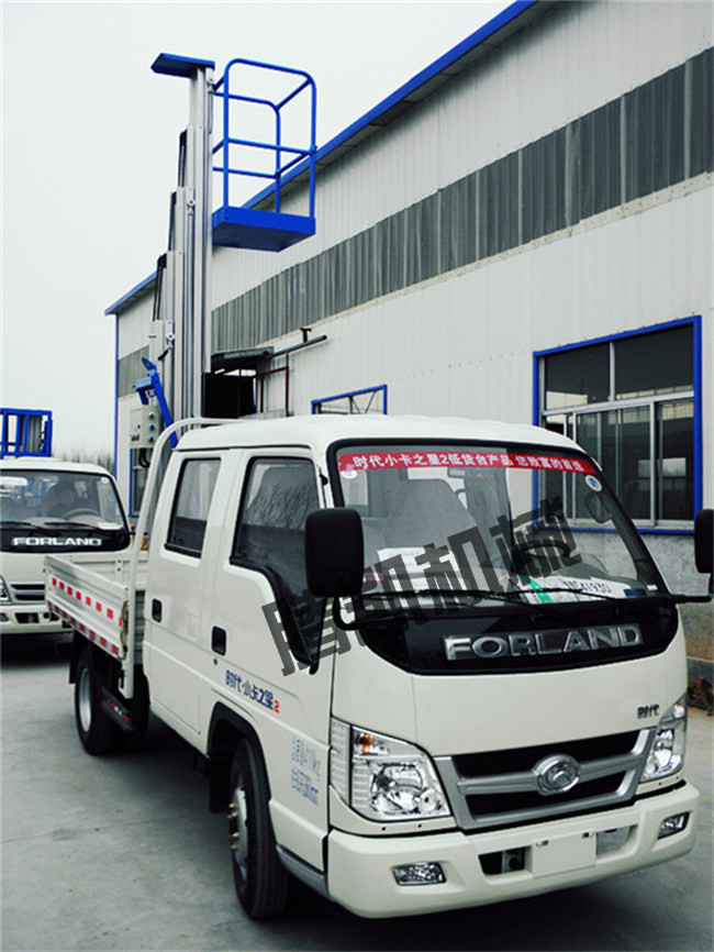 5、车载式升降机具有机动性强、工作范围较大等特点。特别适用于远距离、大范围、不同工作场地的高空作业,如公路交通、路灯照明、工程抢险等。平台动力可使用汽车动力或直流蓄电池,安全可靠。适用的车型有五十铃、BJ1041、江淮(JAC)、依维柯、福田、东风小霸王、时代小卡等轻型货车及皮卡。